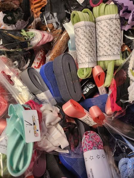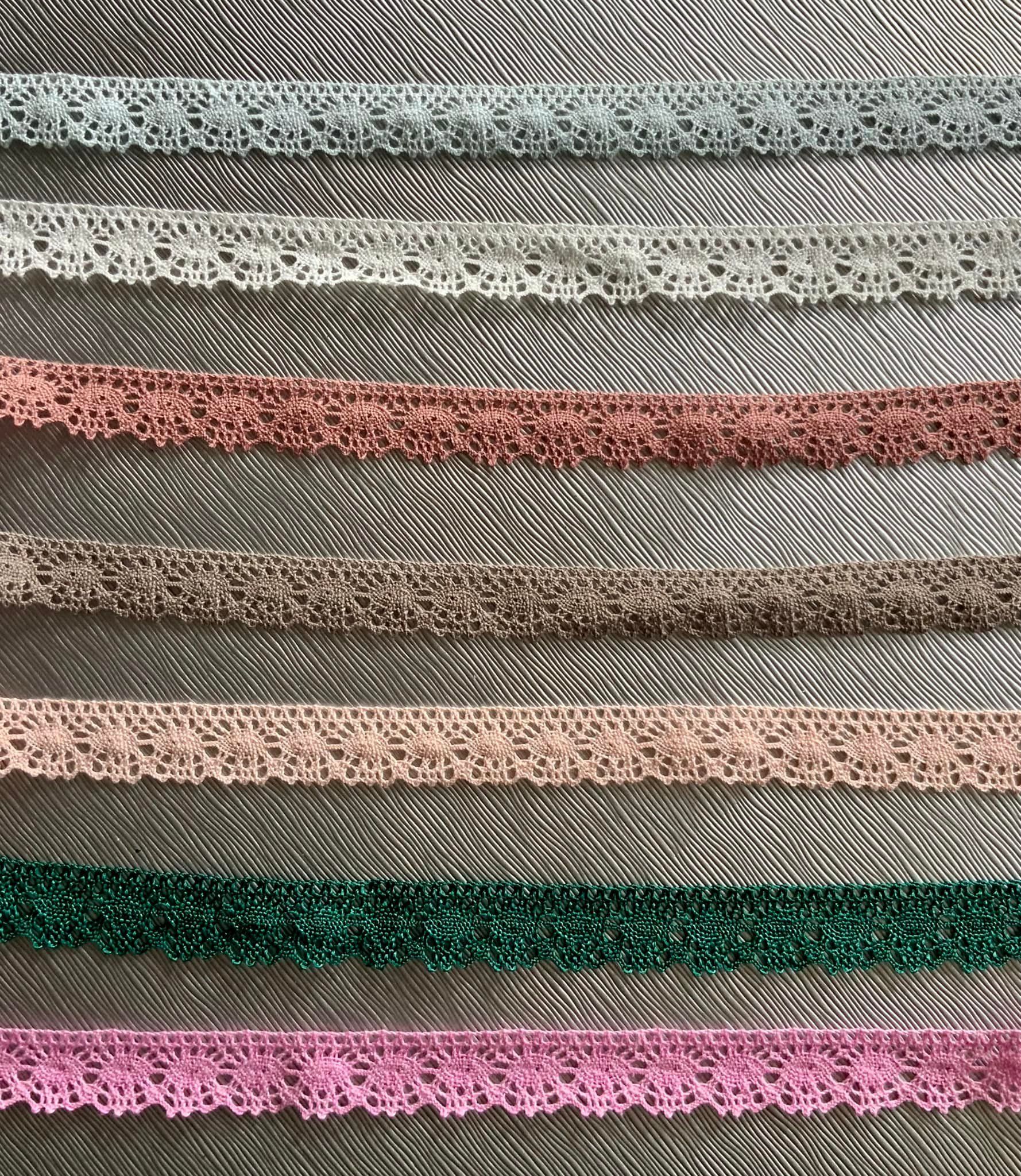 Hier eine Auswahl an Klöppelspitze in verschiedenen Farben und Breiten.