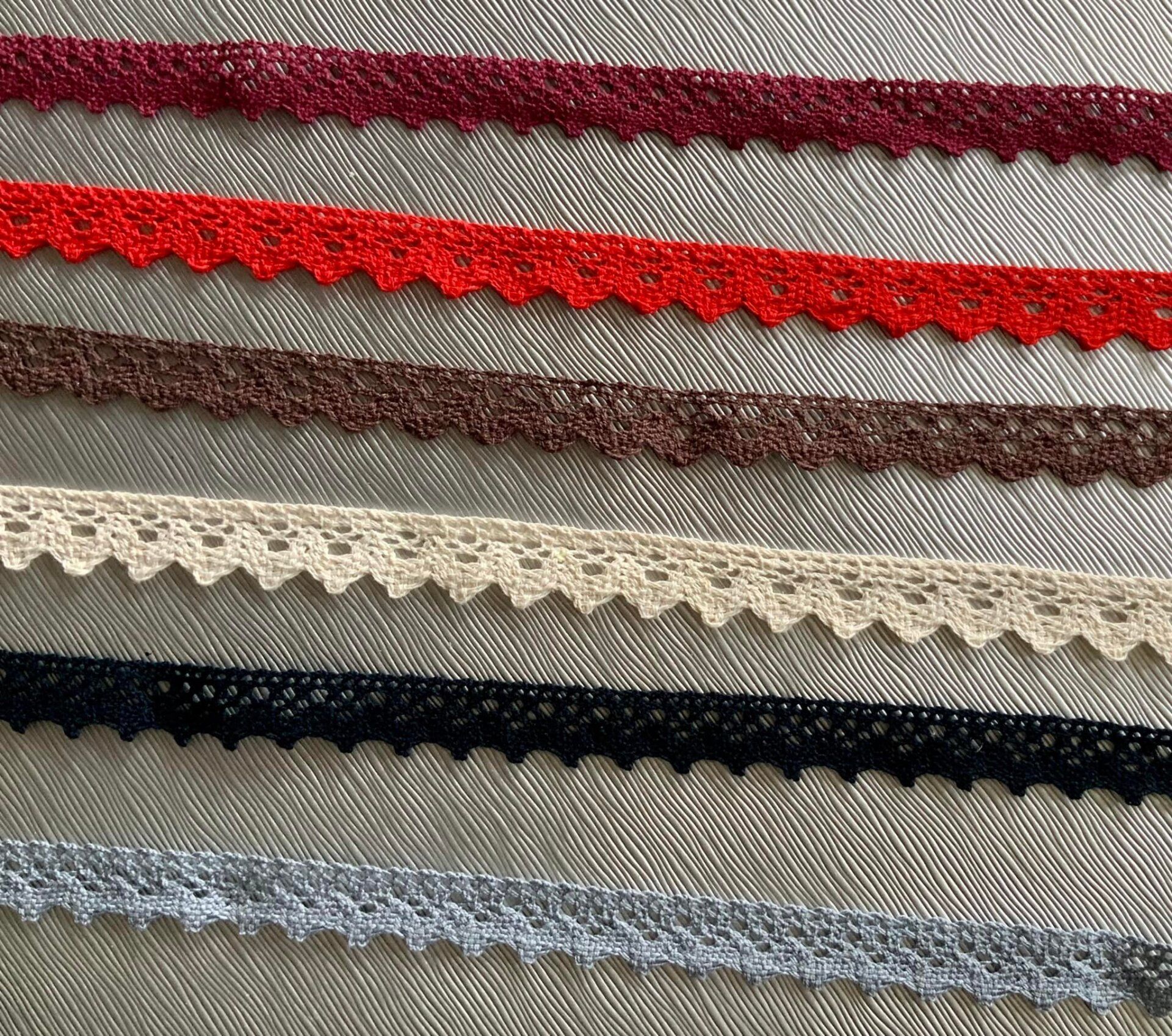 Hier eine Auswahl an Klöppelspitze in verschiedenen Farben und Breiten.